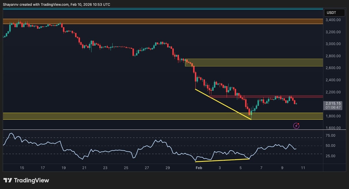On the 4-hour timeframe, the market displays a short-term basing attempt after the steep decline. The price carved out a descending leg that terminated near the $1,800 demand zone while the 4-hour RSI formed a clear bullish divergence, signalling seller exhaustion and prompting the current consolidation above the support zone at $1,800 and below the resistance level at $2,100.