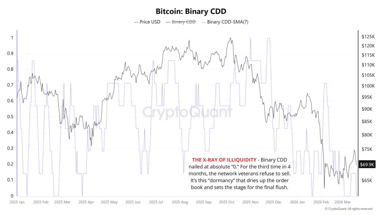 The Binary CDD indicator registered zero in the current period. This metric tracks whether dormant Bitcoin coins are circulating on any given day.