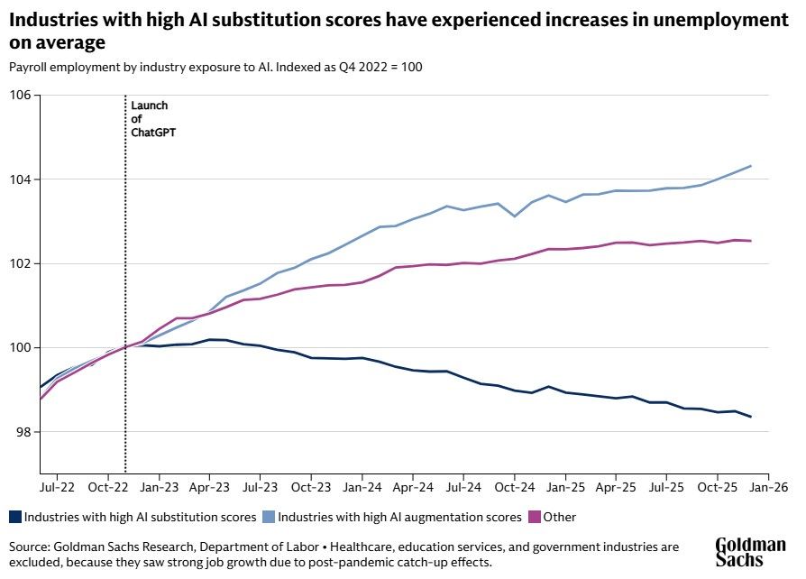 Still, not every exposed role is shrinking. Looking only at occupations with high augmentation potential, Goldman Sachs estimates AI has added roughly 9,000 jobs per month. That modestly lowered the unemployment rate.