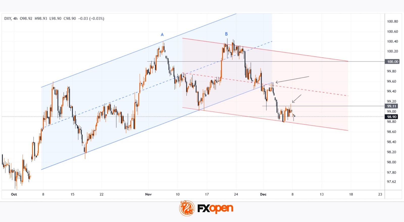 The dollar index chart indicates that selling pressure is dominant (as shown by the arrows):