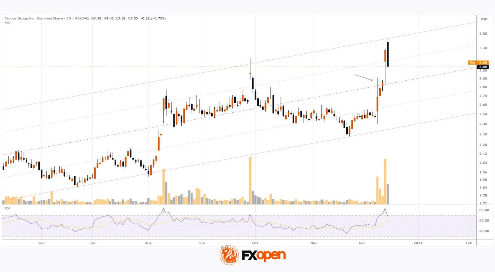 Technical analysis shows that in the second half of 2025, CRON shares have been trending higher, forming an ascending channel. Within this structure: