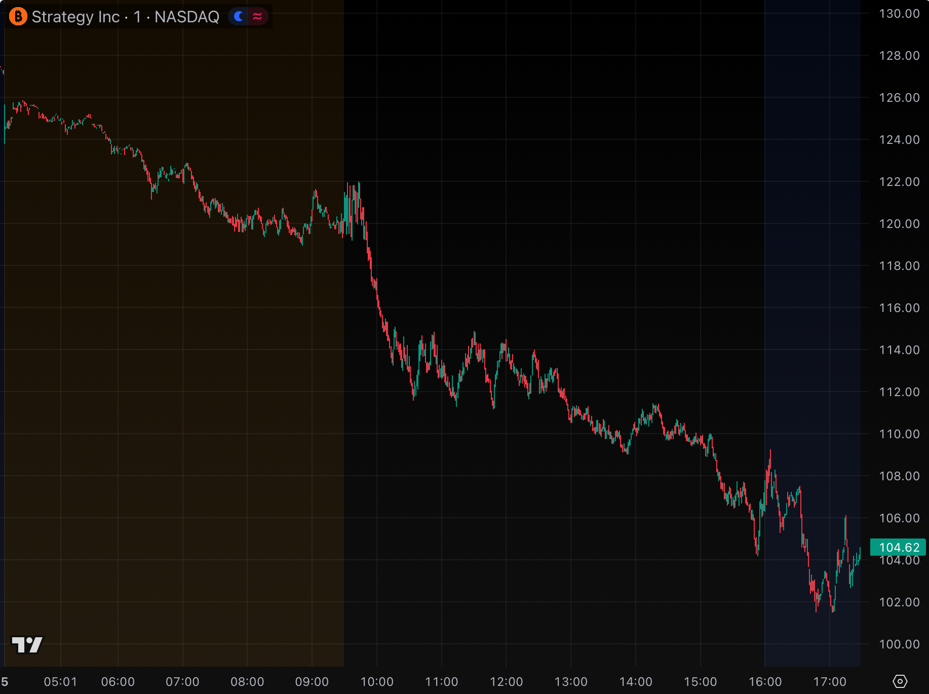 - Strategy (MSTR): closed at $106.99 (-17.12%), +6.71% at $114.17