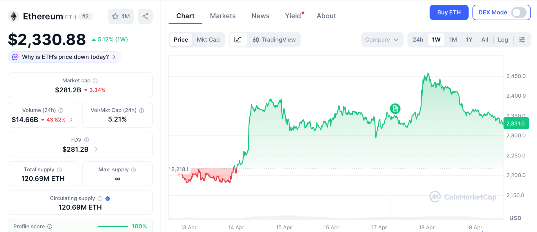 Ethereum (ETH) trades near $2,330 per CoinMarketCap, up roughly 5.12% on the week after clearing the $2,330 ascending triangle resistance that held the price down for weeks.
