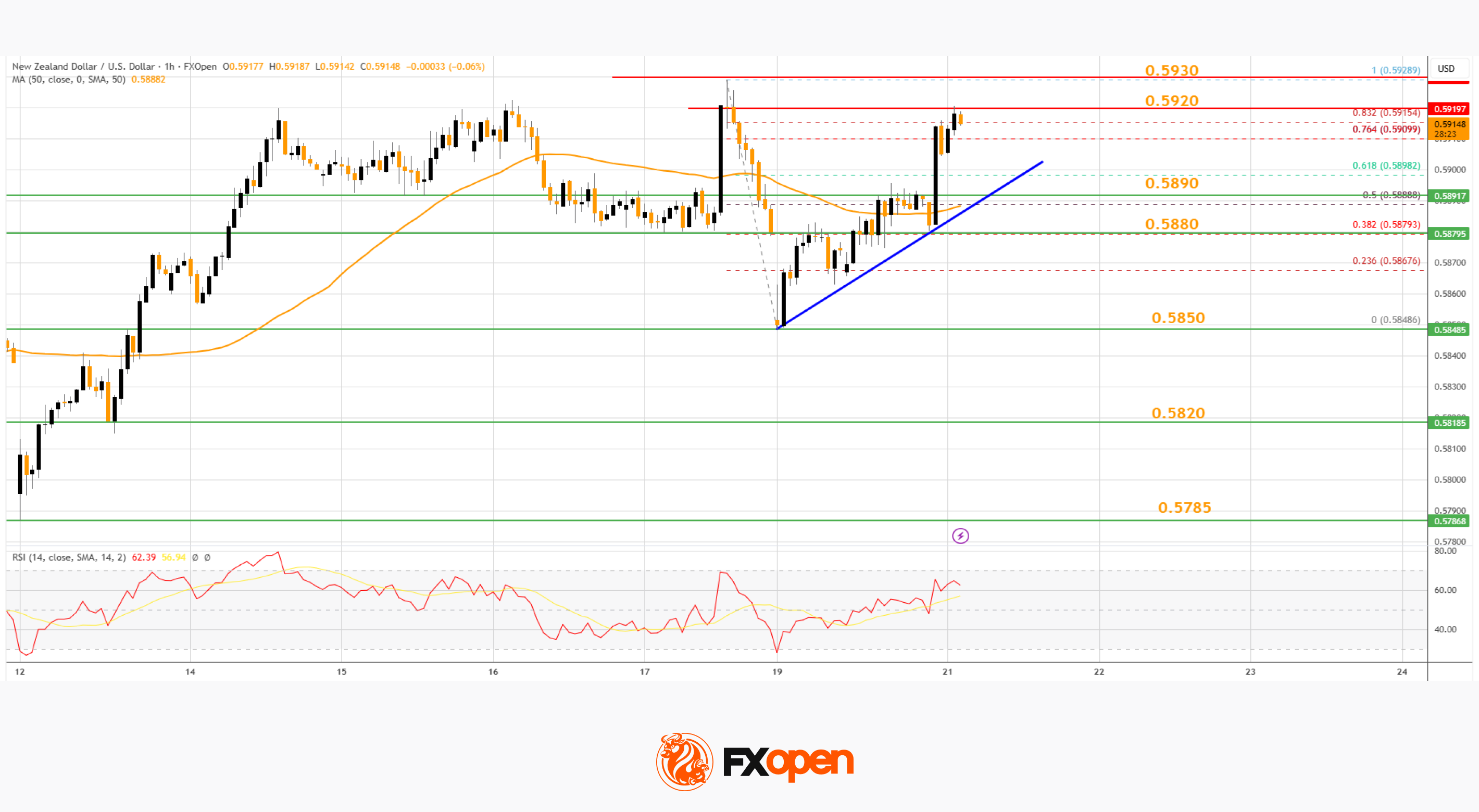 • There is a bullish trend line forming with support at 0.5890 on the hourly chart of NZD/USD at FXOpen.