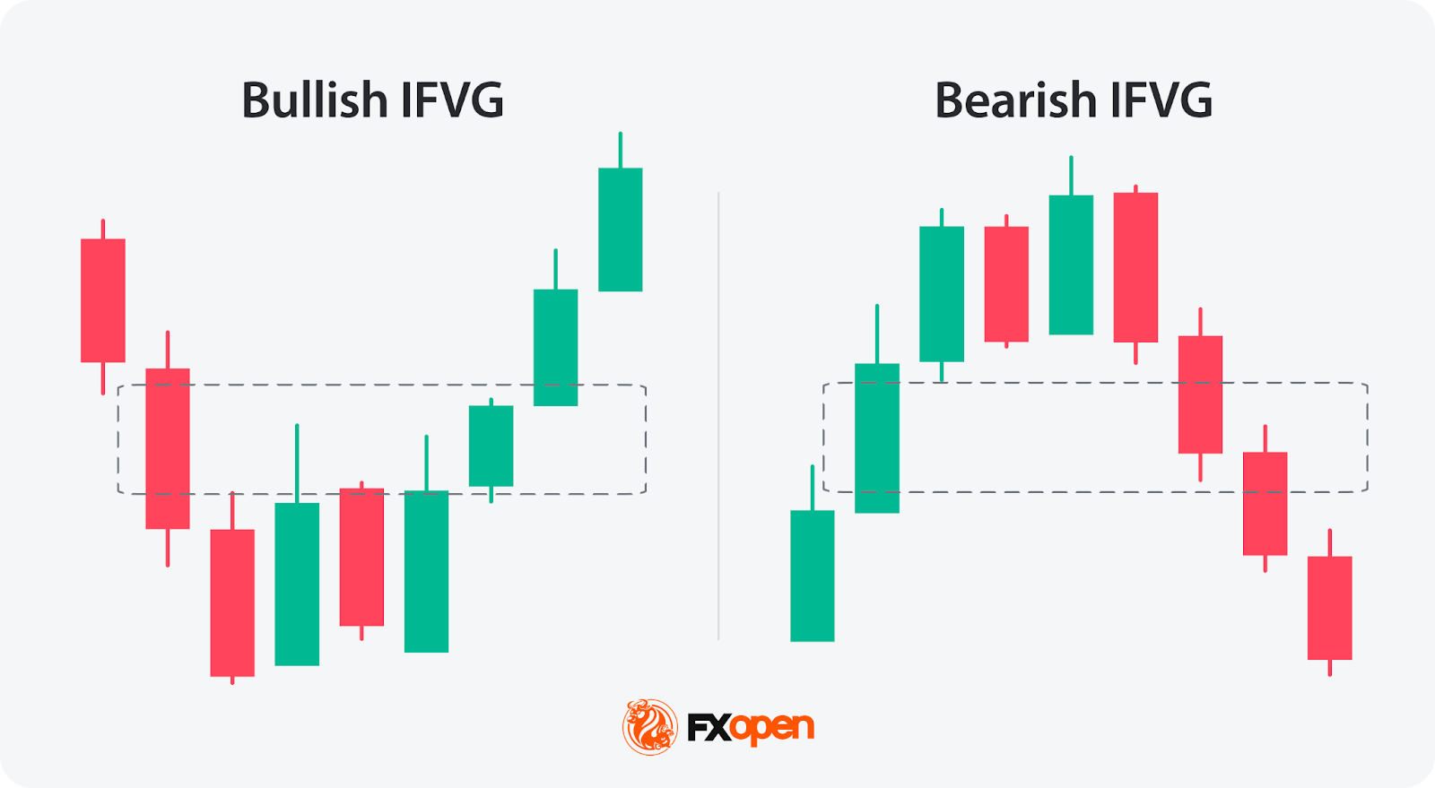 The IFVG meaning refers to a formation that occurs when a Fair Value Gap (FVG) is invalidated. For example, a bearish FVG becomes bullish after the price breaks above it, creating a potential support zone. Similarly, a bullish FVG can transform into a bearish IFVG if the price breaks below it, creating a potential resistance zone. IFVGs highlight shifts in market sentiment, providing traders with areas of interest for analysing possible reversals or continuation zones.