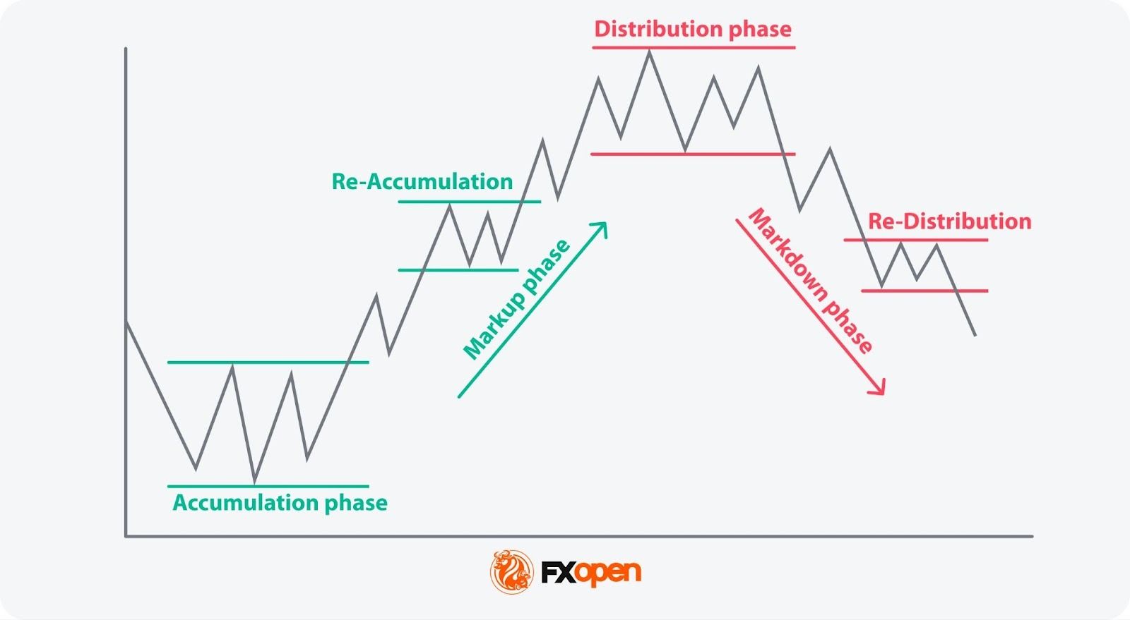 Distribution reflects the opposite scenario, where large holders begin to sell their holdings, usually after a rise. This selling does not immediately lead to a drop; it happens subtly to prevent a drastic decrease in price. Following a distribution phase, a redistribution might occur where selling continues after a minor rally or consolidation—this process may help solidify a supply zone.