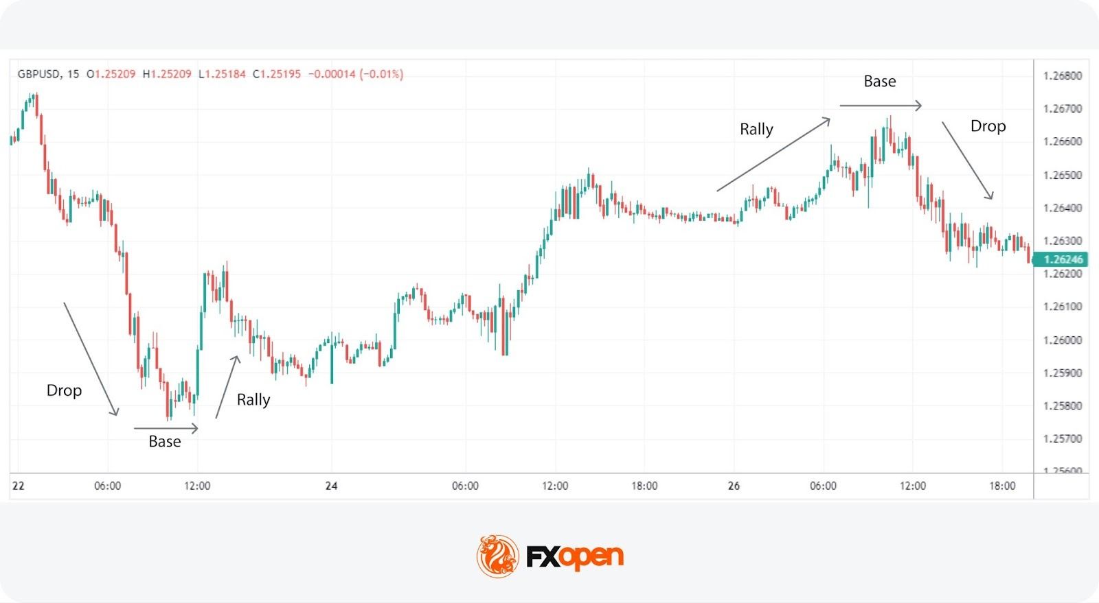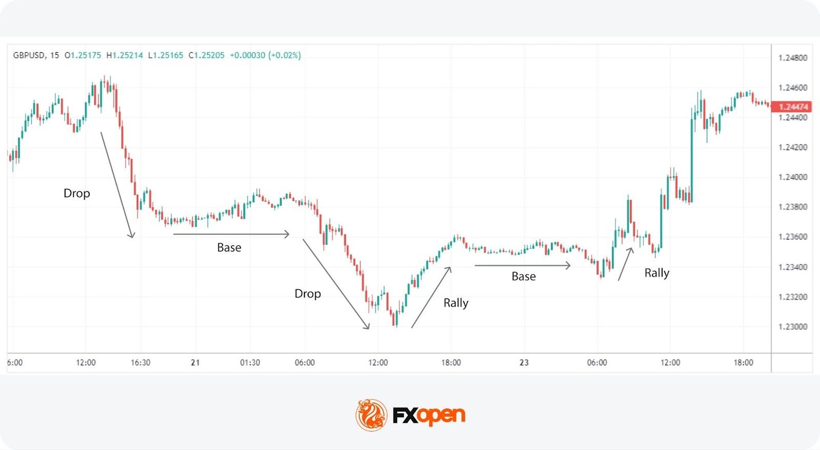 - Four core patterns appear around these zones: Rally-Base-Rally, Drop-Base-Drop, Rally-Base-Drop, and Drop-Base-Rally, each reflecting continuation or reversal behaviour.