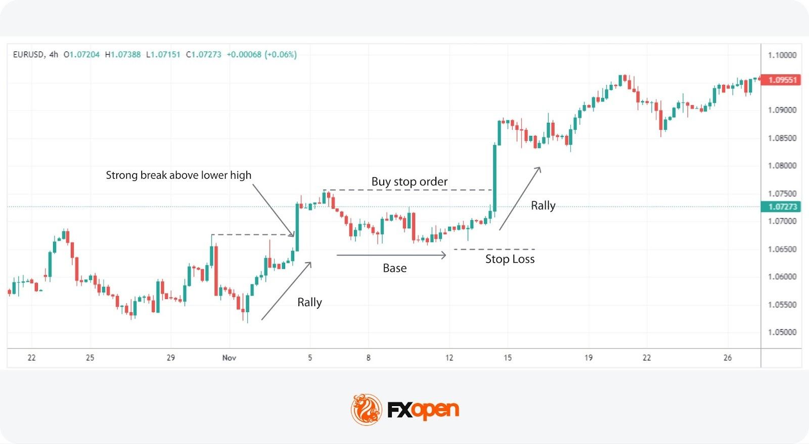 Traders look to this pattern as it leverages the momentum generated from a strong initial move (rally or drop) followed by a stabilisation period (base) that offers a clear breakout point, indicating a potential trend continuation.