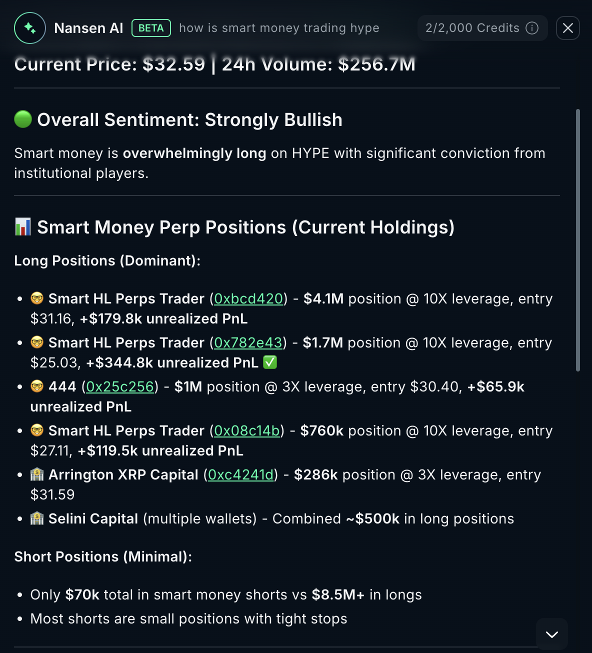 According to Nansen AI, overall sentiment on HYPE among tracked smart money wallets reads “strongly bullish.”