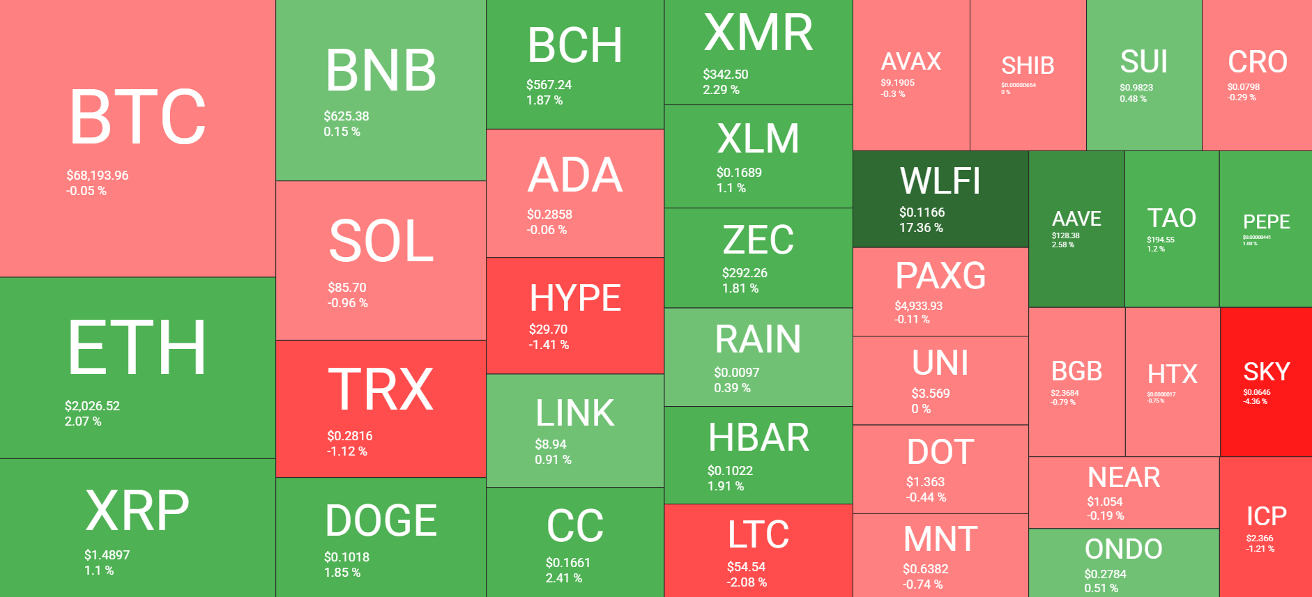 The largest cryptocurrency briefly tried to reclaim the level on Monday, only to be pushed down toward $67,000 as sellers emerged around the breakout zone. It was trading near $68,000 early Wednesday, roughly flat on the day but now sitting under what had been short-term support.