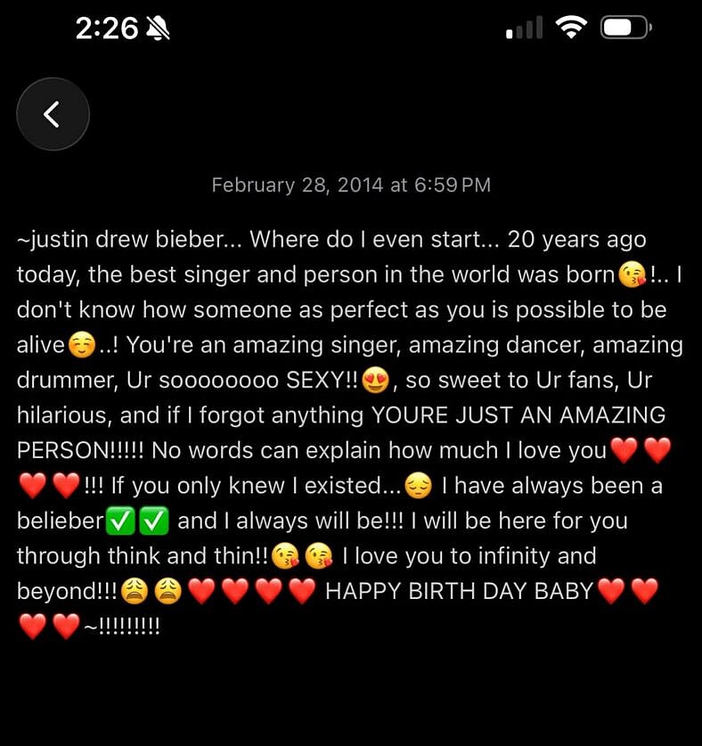 Other photos featured Eilish wearing Bieber merch, and one was a photo of her cellphone case with the “Baby” singer posing with a backward ball cap sans shirt. Eilish also posted a message she wrote Bieber on February 28, 2014, a few days before his 20th birthday. In it, she called him “SEXY,” “sweet,” “hilarious,” and “AN AMAZING PERSON.”