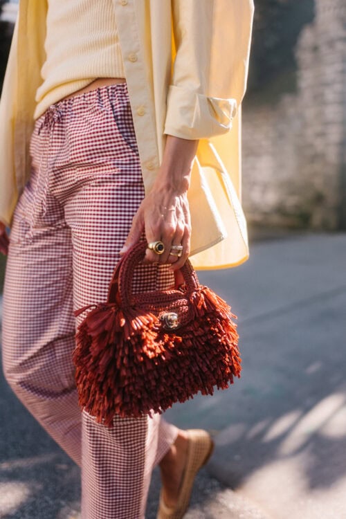 This is where the outfit sharpens. Woven finishes, fringe, beading, raffia—anything with dimension. It adds richness and contrast, especially against lighter fabrics or softer color palettes. It’s less about matching and more about layering in something tactile that feels intentional and distinct.