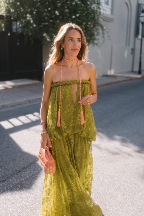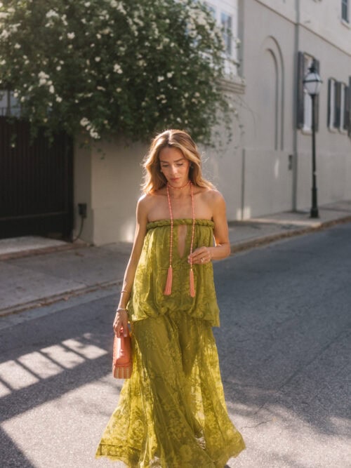 Zimmermann Dress, JB x Jennifer Behr Charleston & Montagu Necklaces, Loro Piana Bag (similar here)