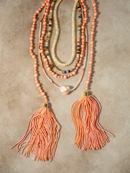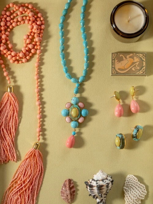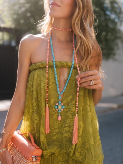 Turquoise has been a constant across all four collections, and this time I wanted to pair it with coral, one of my favorite combinations for warm weather. It shows up across statement necklaces, longer layered strands, and the tassel styles I’ve been reaching for on repeat. The tassels feel like an instant outfit-maker, designed to move from day into evening and styled multiple ways.