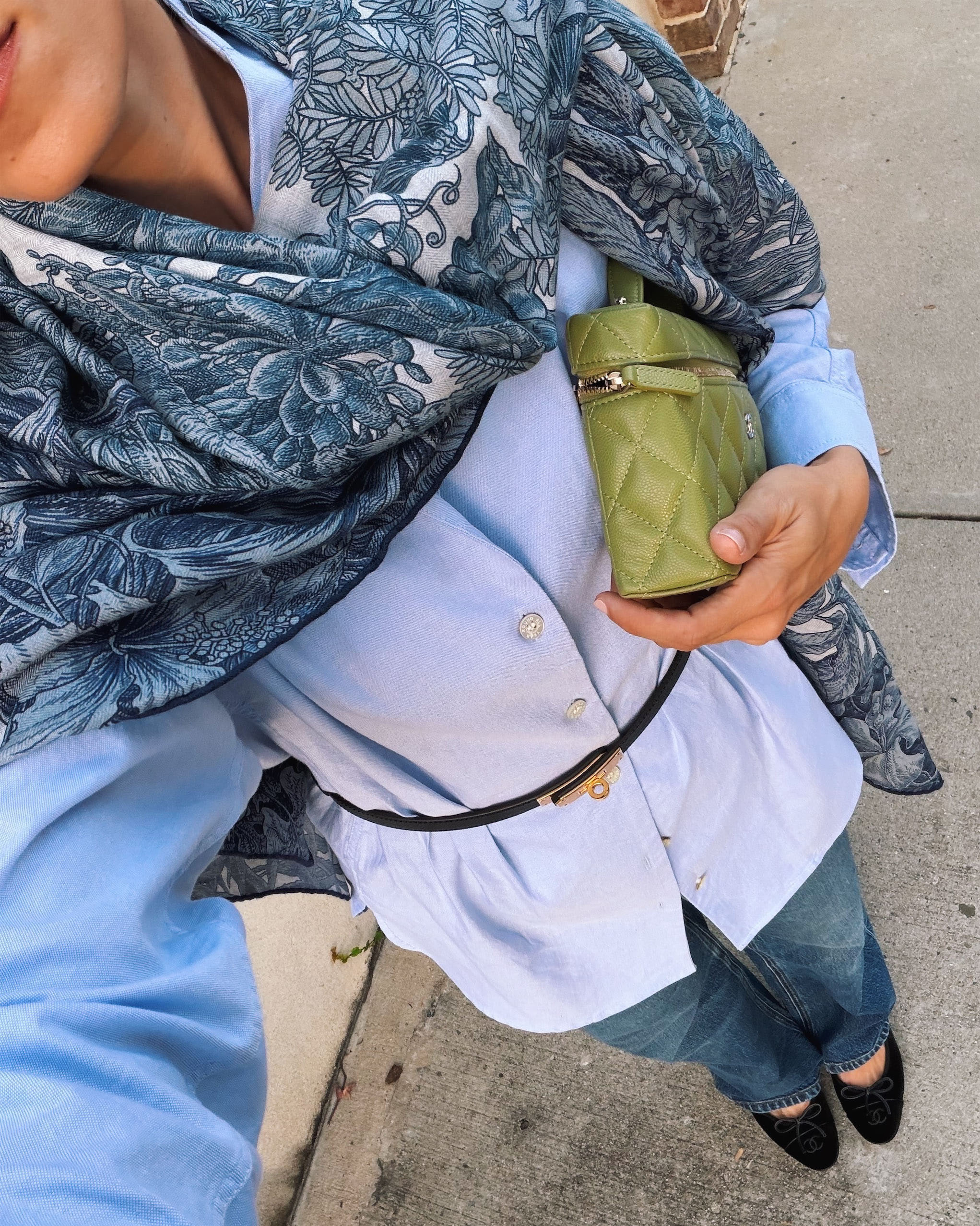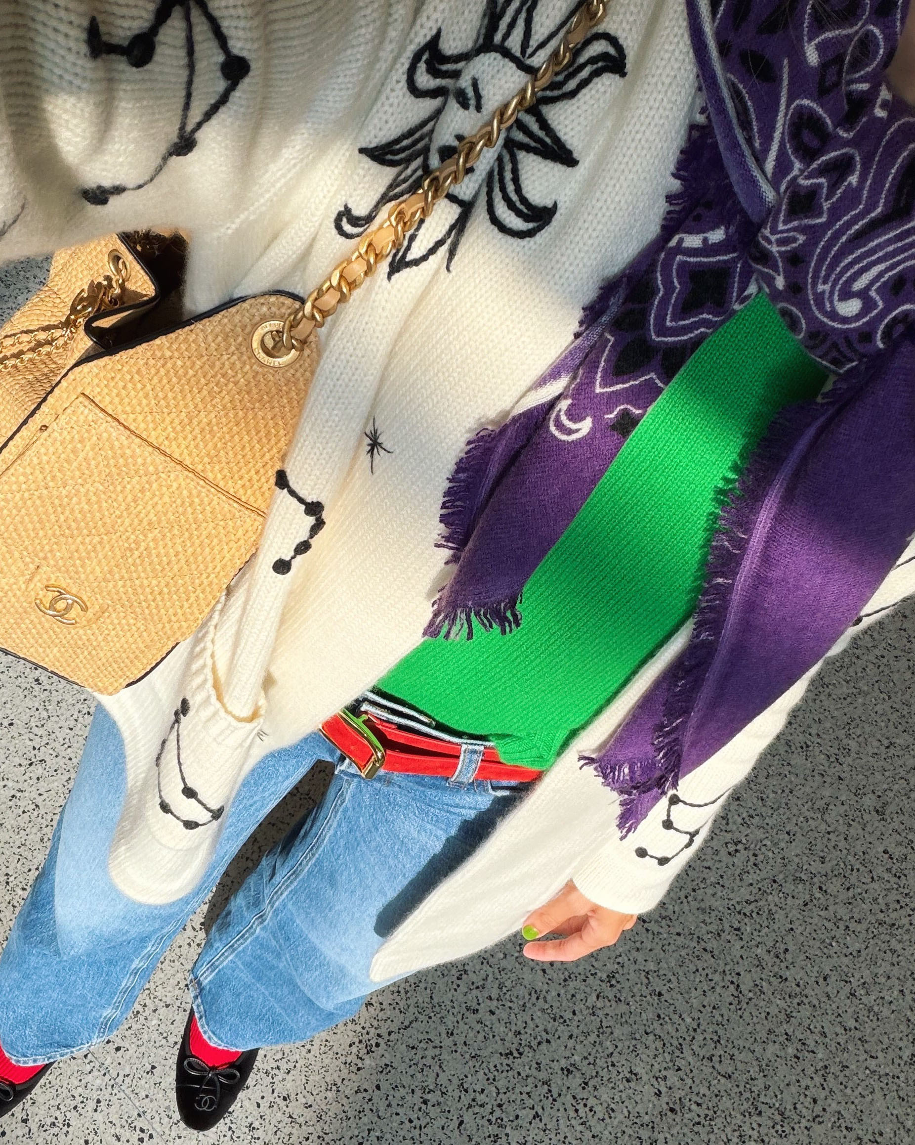 Free People Jacket, The Row Shirt (old, similar here), AYR Jeans, Khaite Belt (on sale, similar here), Juliette Necklace, Chanel Flats (similar here), Dior Bag (also available here, similar here) | AYR Shirt & Jeans, Hermes Belt & Scarf, Chanel Flats (similar here) | Kujten Cardigan & Scarf, Chanel Bag & Flats (similar here), AYR Jeans | Staud Jacket, The Row Shirt (old, similar here), Sea NY Sweater (old, similar here and here), Guest In Residence Red Sweater (old, similar here), AYR Jeans, Dior Sunglasses, Loewe Clutch (similar here), Chanel Flats (similar here)