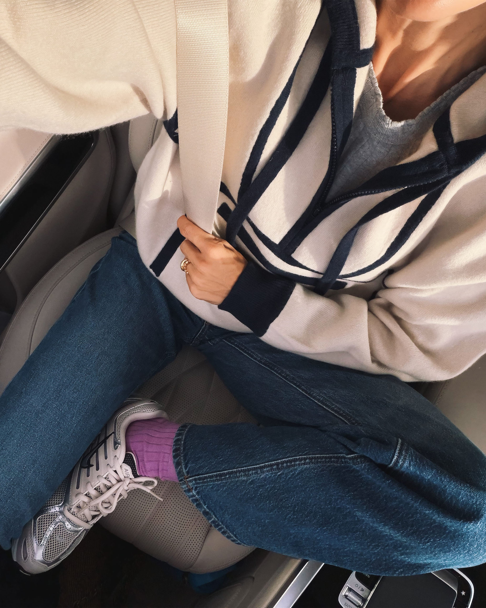 White + Warren Sweater, Marea Shirt, AYR Jeans, Nike Sneakers, Comme Si Socks |Anine Bing Jacket (similar here), Similar Embroidered Jacket, Perfect White Tee, AYR Jeans (similar here), Chanel Flats (old, similar here), Saint Laurent Sunglasses