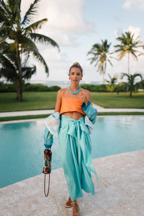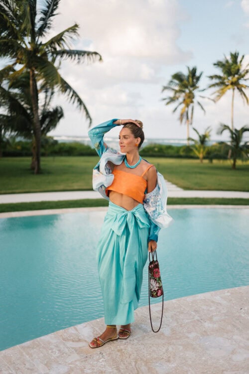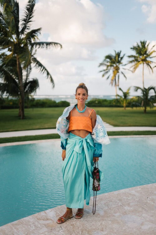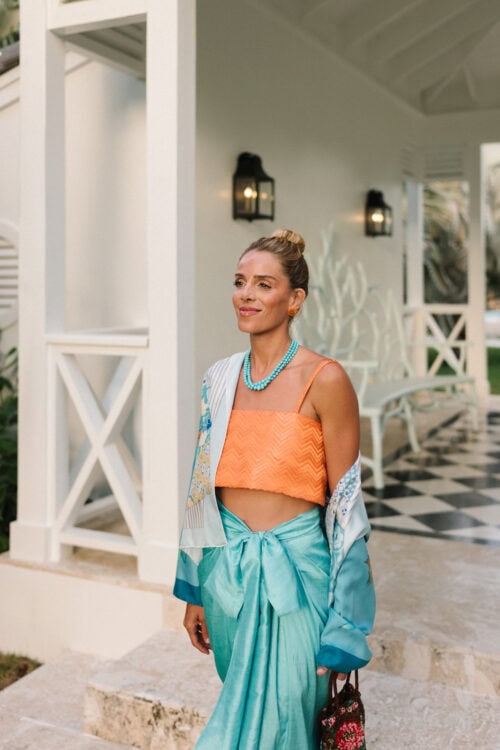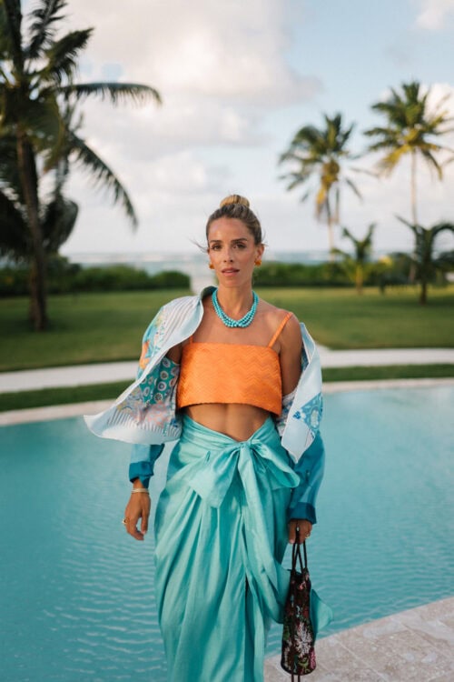 It usually starts with one piece. An orange dress or set, then adding turquoise through jewelry, or the reverse if I’m wearing something softer and want a stronger pop of color. It’s never the same formula twice, but the full look always ends up feeling balanced.