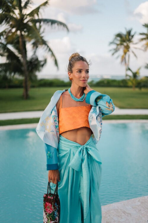 LilyEve Jacket, Rosie Assoulin Top (sold out, similar here), Julia Amory Skirt, JB x Margaux Sandals, Irene Neuwirth Earrings & Necklace, Cordera Bag (sold out, similar here)