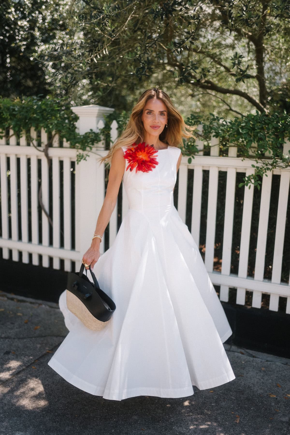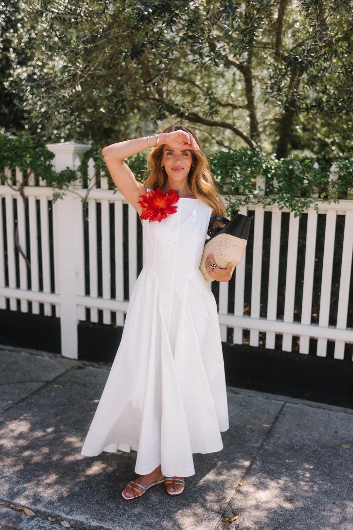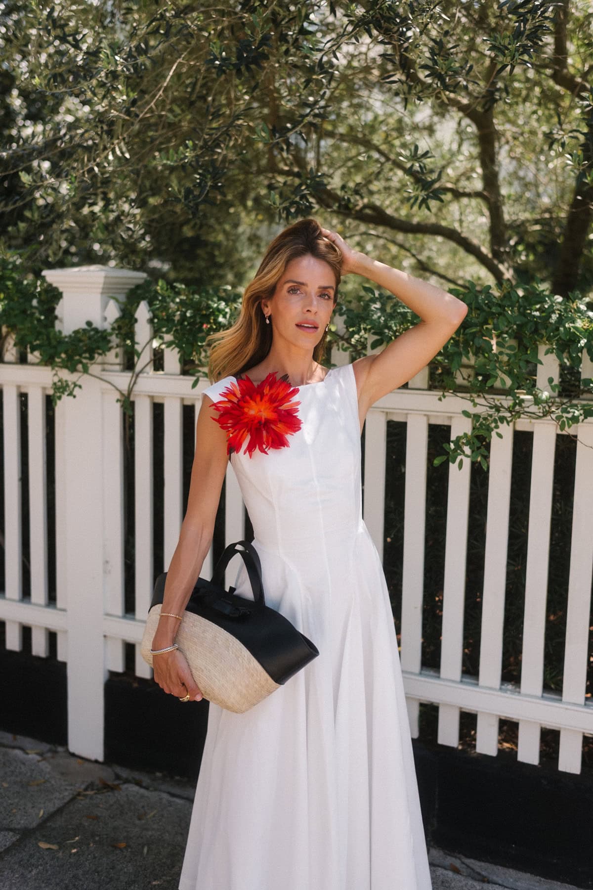 What makes them especially good now is the styling. A touch of red gives the white dress a sharper finish. It adds contrast and a strong sense of color that makes the whole look feel more considered.