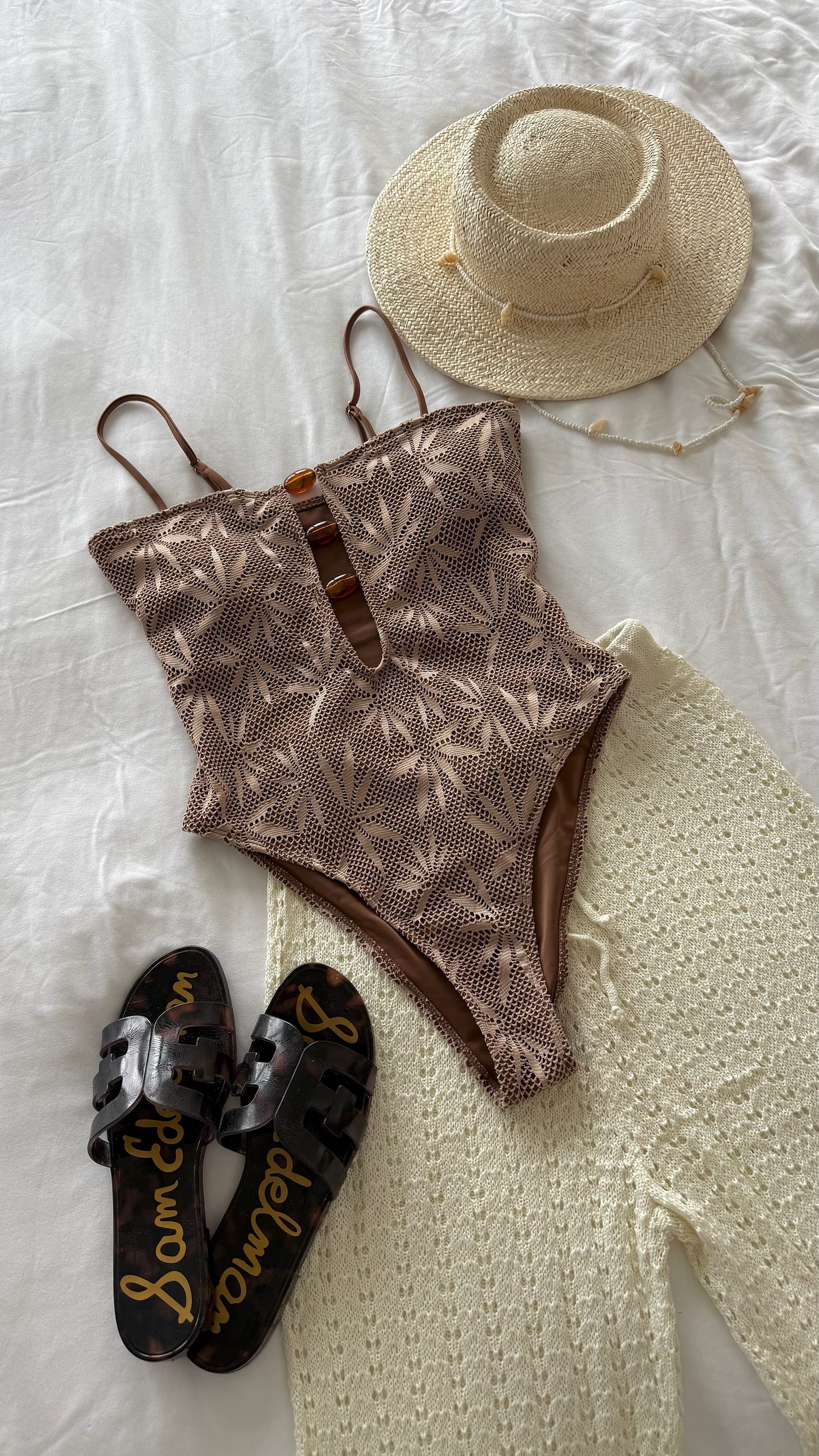 This one piece brown swimsuit is a major win – obsessed!! Holds you in and super flattering and just overall such a great mom swimsuit. All items including these white coverup pants, jelly sandals and sun hat linked here.