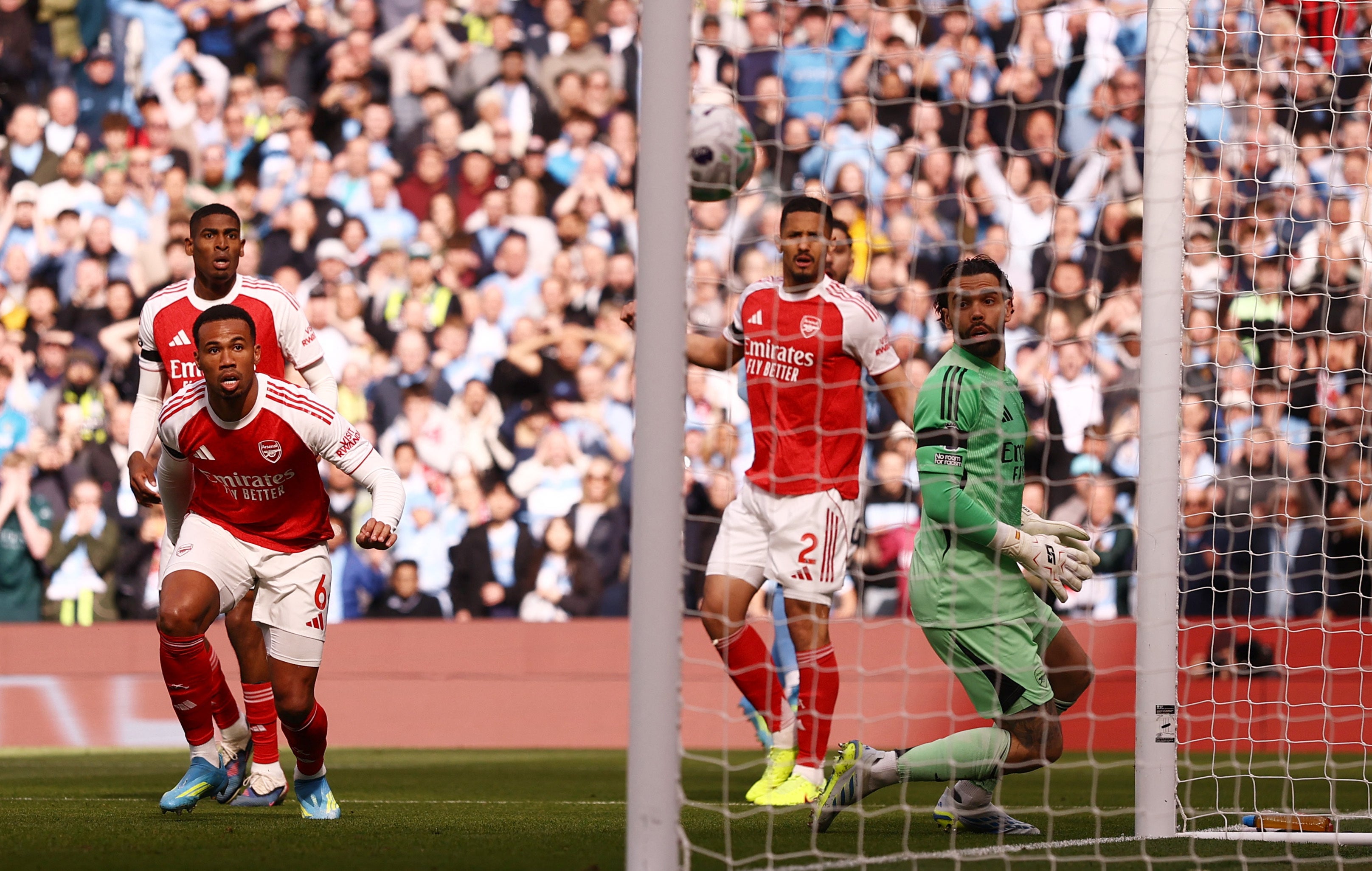 Raya makes a low save from Haaland and the rebound falls to Cherki. He fires towards goal and it takes a deflection off Gabriel and rebounds off the inside of the post and back into the grateful grasp of Raya!