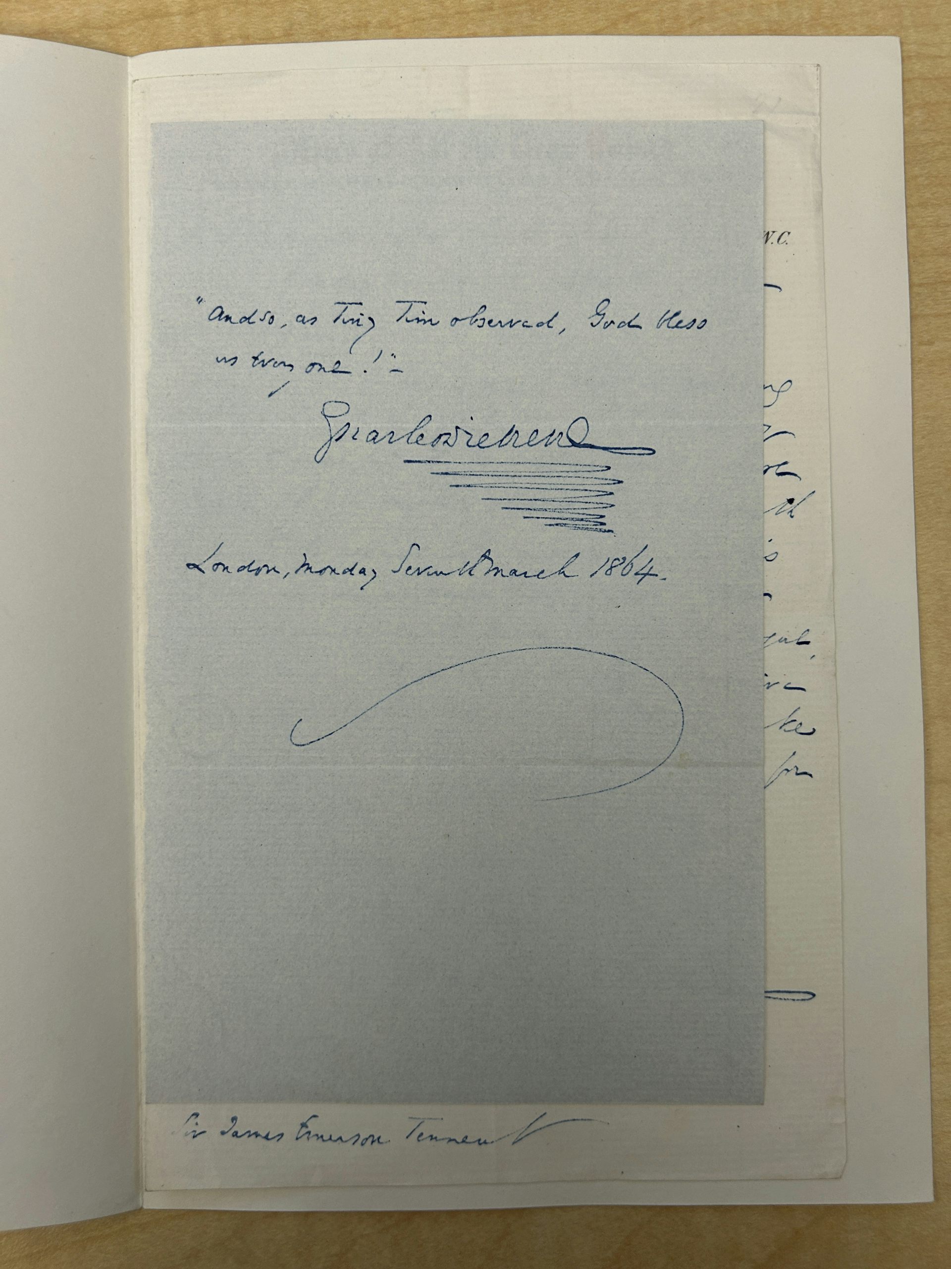 What survives of these autographs, written for fans in Britain and America, suggests that the passage he typically used was the death of Little Nell in The Old Curiosity Shop (1841). His unusual choice of the final line from A Christmas Carol therefore seems deliberate for this specific context.
