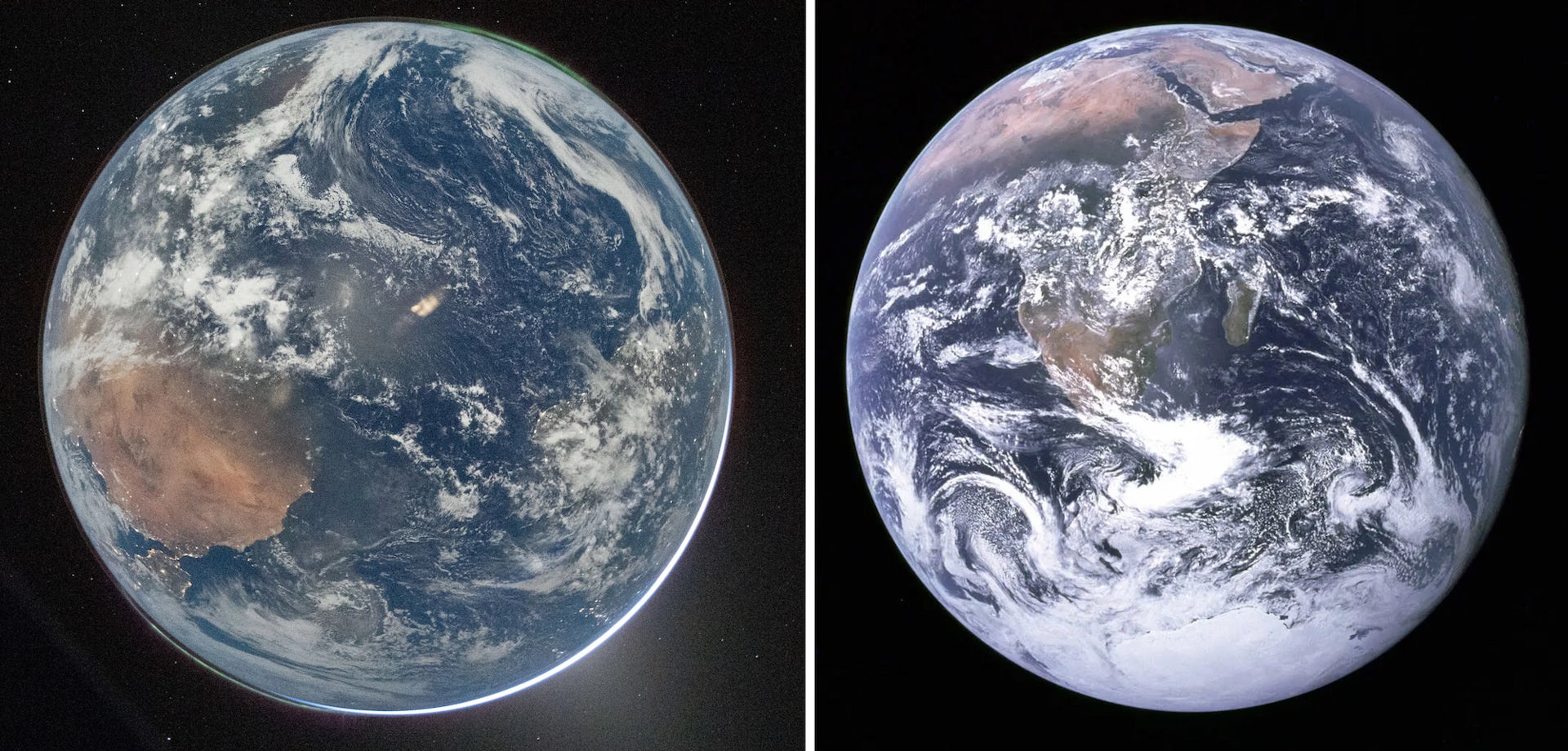 Left: the 1972 Blue Marble image from Apollo 17; right: the 2022 image from DSCOVR. The comparison reveals the effects of deforestation in Madagascar and desertification in the Sahara. Nasa