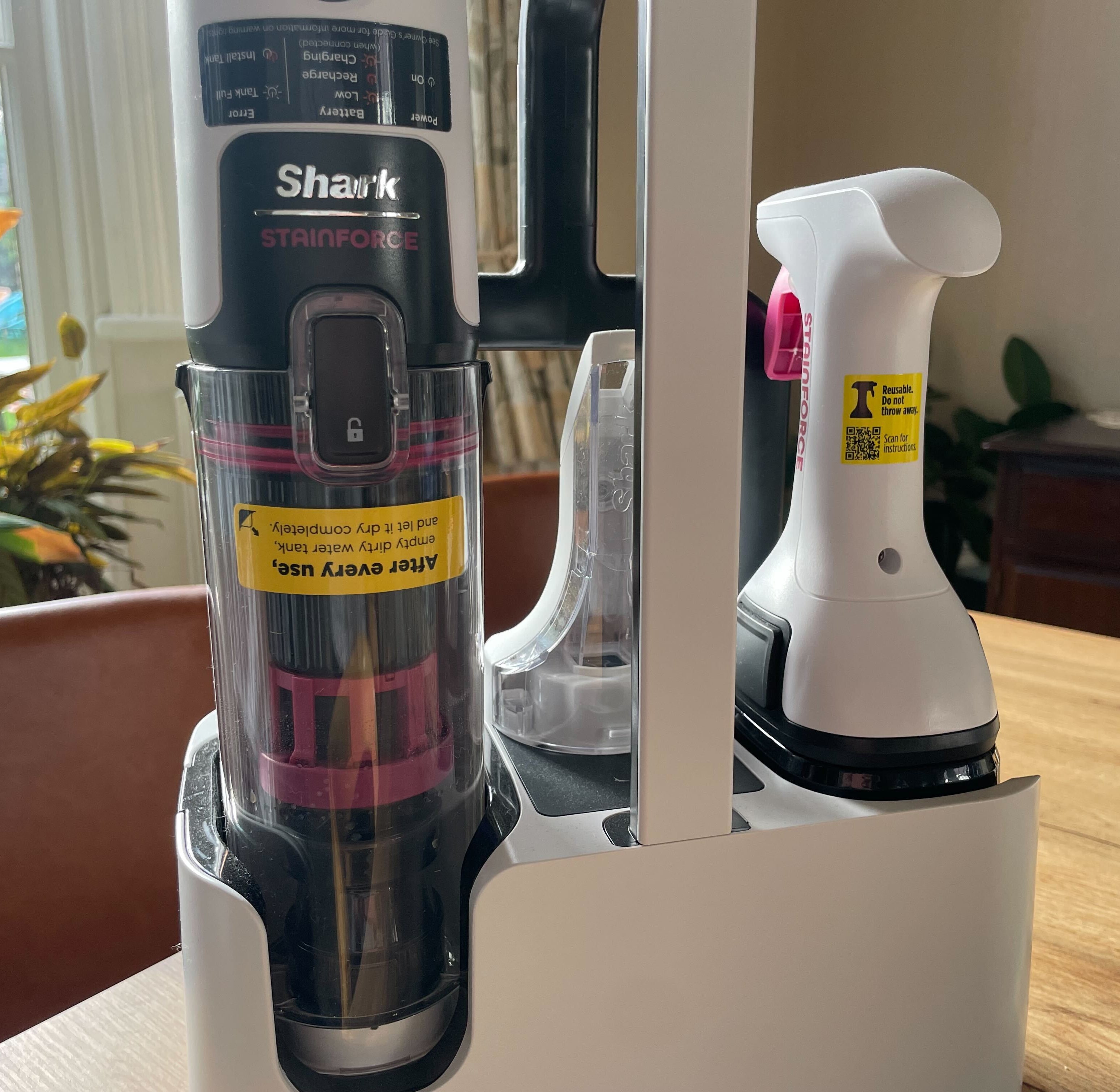 So, I was extremely intrigued by Shark’s StainForce Cordless Spot Cleaner which teams a stainer remover spray – which seems to do a lot of the heavy lifting, to be fair – with a powerful suction tool.