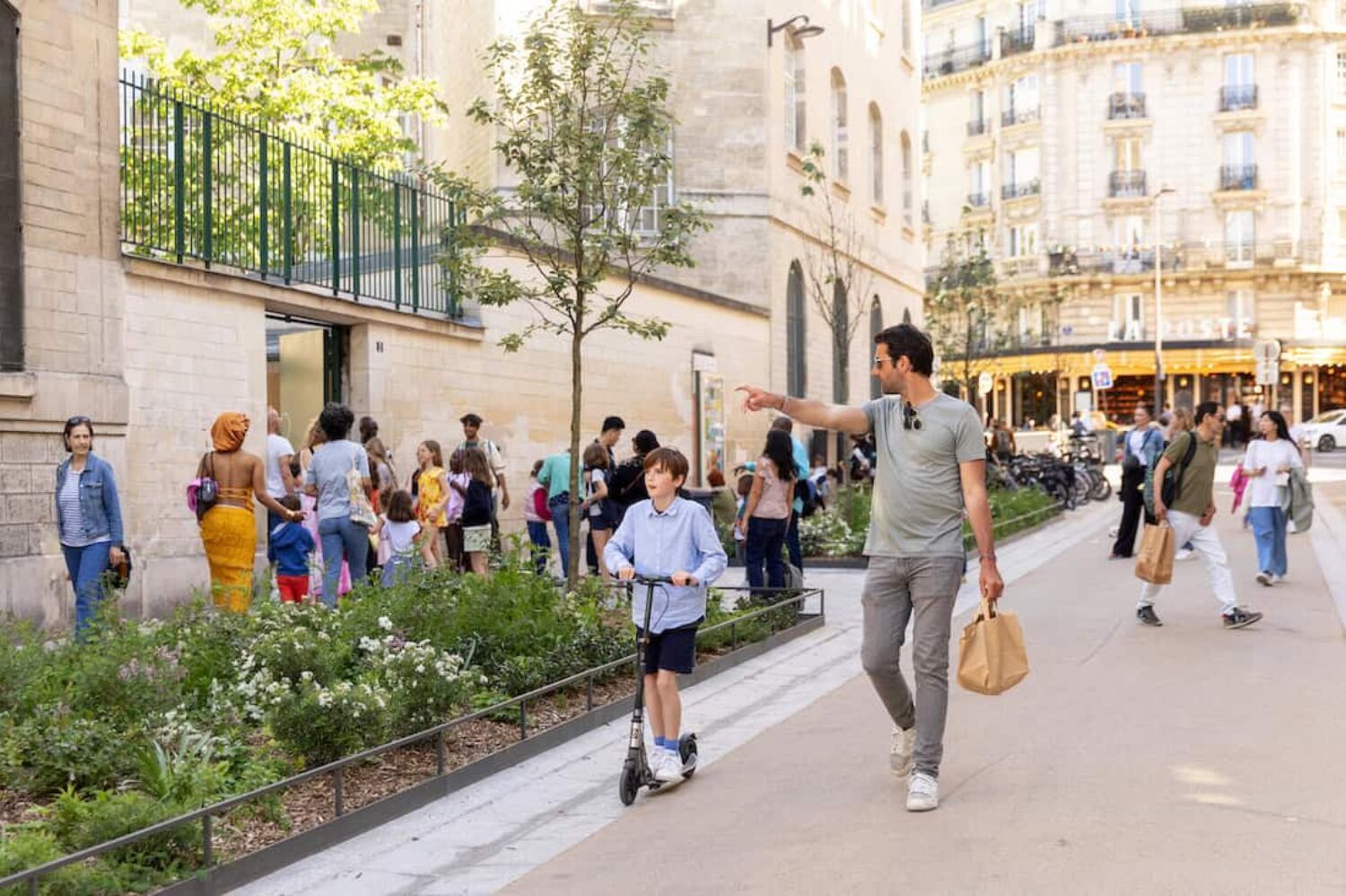 More than 300 school streets have been created in Paris, removing cars, planting trees and reclaiming public spaces outside schools. Image: Joséphine Brueder/Ville de Paris