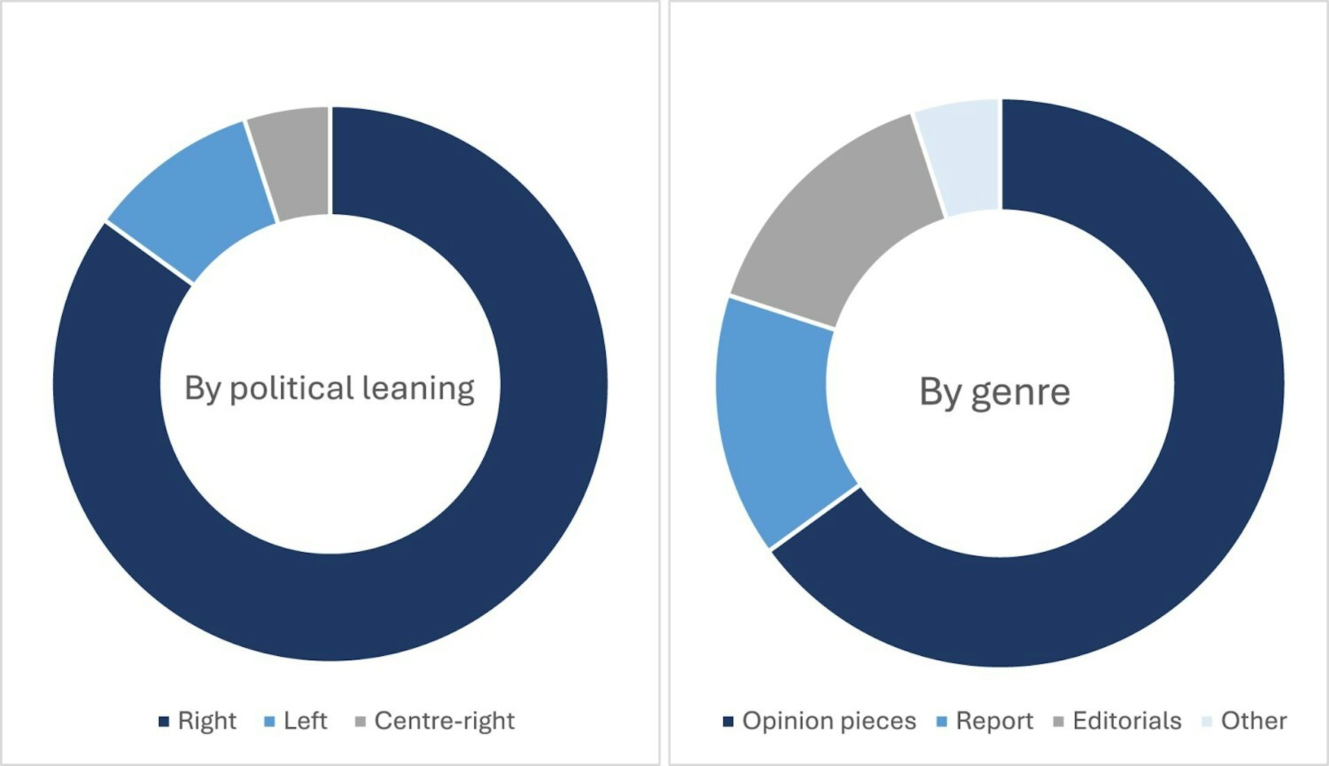Broken down by political leaning (of the newspaper) and genre. Right-wing titles and opinion pieces dominate.