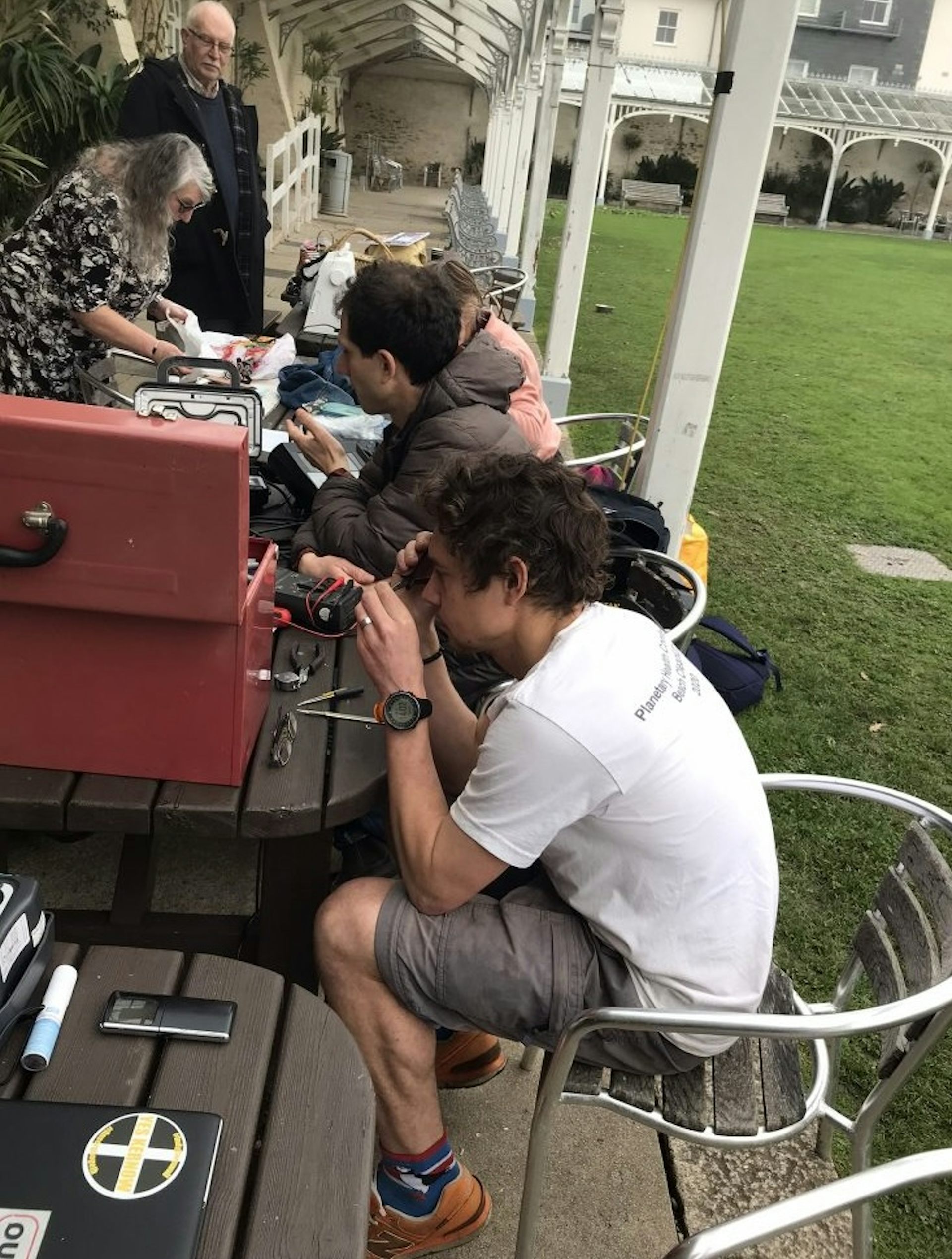 Stuart Walker (in white shirt) helping people repair items in Falmouth, Cornwall.