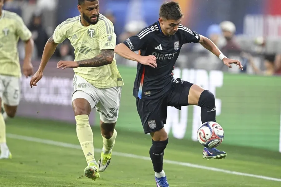 Apr 25, 2026; San Diego, California, USA; San Diego FC midfielder David Vazquez (19, right), fights for the ball with Portland Timbers midfielder José Caicedo (30)...