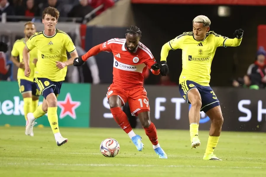 Apr 4, 2026; Chicago, Illinois, USA; Chicago Fire FC forward Jonathan Bamba (19) and Nashville SC defender Andy Najar (31) battle for control of the ball...