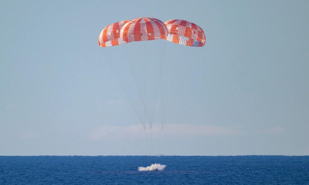 NASA’s Orion spacecraft splashes into the Pacific Ocean, as seen in an overhead view. (NASA via YouTube) Four astronauts and their Orion space capsule splashed down...