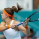 Mar 26, 2026; Miami Gardens, FL, USA; Karolina Muchova of the Czech Republic hits a shot against Coco Gauff of the United States in the semi-finals...