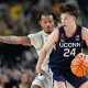 Apr 6, 2026; Indianapolis, IN, USA; UConn Huskies guard Braylon Mullins (24) controls the ball against Michigan Wolverines guard Roddy Gayle Jr. (11) during the second...