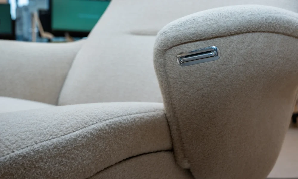 The chair starts at $8,995, but that doesn’t include the side table or ottoman. Add those and it costs $10,995. The model pictured above uses Alpaca...