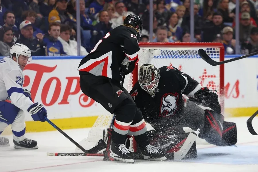 Apr 6, 2026; Buffalo, New York, USA; Buffalo Sabres goaltender Ukko-Pekka Luukkonen (1) makes a save on Tampa Bay Lightning center Brayden Point (21) during the...