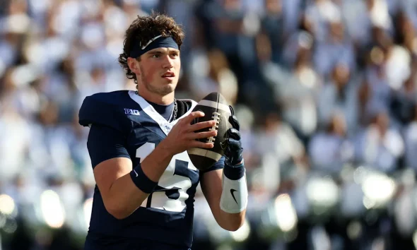Oct 11, 2025; University Park, Pennsylvania, USA; Penn State Nittany Lions quarterback Drew Allar (15) looks to throw a pass during the first quarter against the...