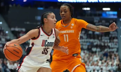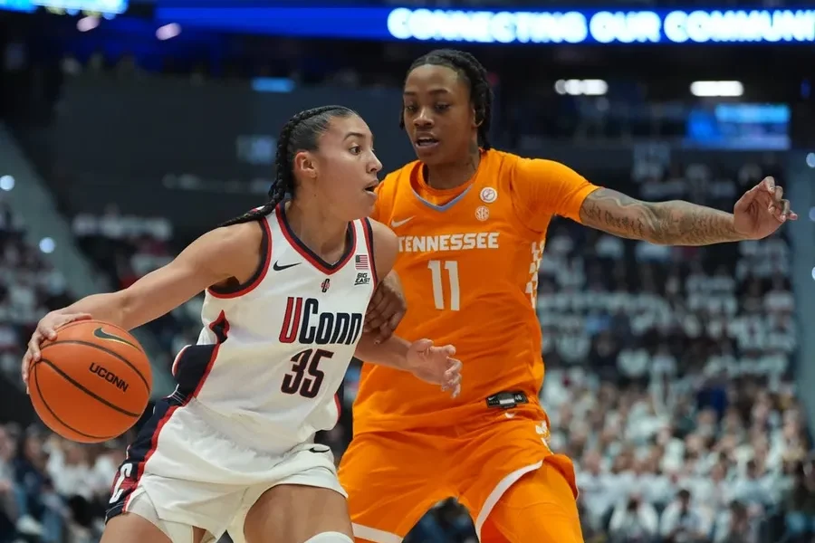 Feb 1, 2026; Hartford, Connecticut, USA; UConn Huskies guard Azzi Fudd (35) drives the ball against Tennessee Volunteers forward Zee Spearman (11) in the first half...
