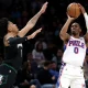 Feb 22, 2026; Minneapolis, Minnesota, USA; Philadelphia 76ers guard Tyrese Maxey (0) shoots over Minnesota Timberwolves guard Terrence Shannon Jr. (1) during the first half at...
