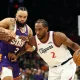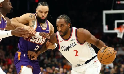 Feb 1, 2026; Phoenix, Arizona, USA; Los Angeles Clippers forward Kawhi Leonard (2) against Phoenix Suns forward Dillon Brooks (3) in the first half at Mortgage...