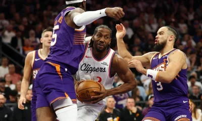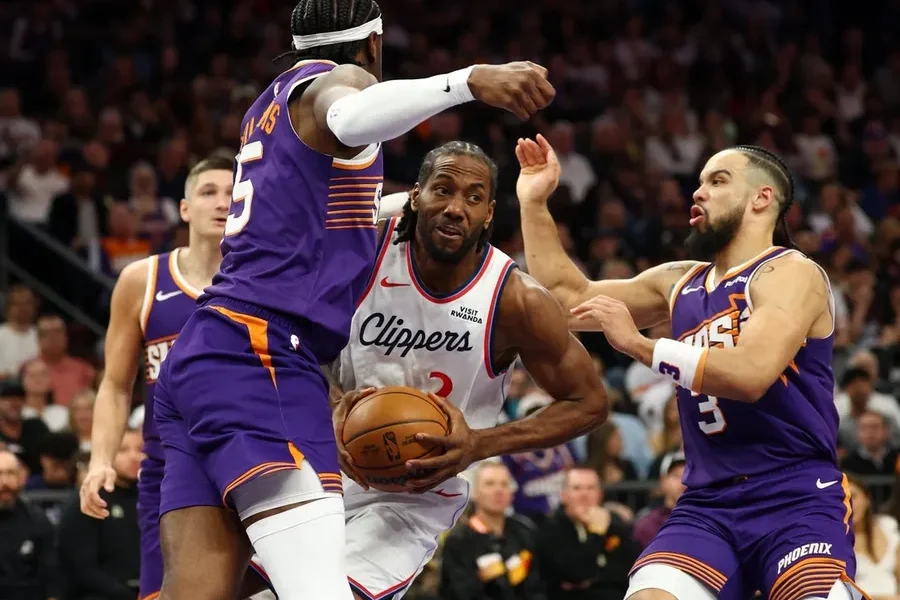Feb 1, 2026; Phoenix, Arizona, USA; Los Angeles Clippers forward Kawhi Leonard (2) drives to the basket against Phoenix Suns forward Dillon Brooks (3) and center...