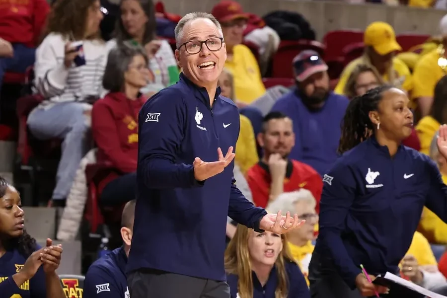 Jan 11, 2026; Ames, Iowa, USA; West Virginia Mountaineers head coach Mark Kellogg watches his team play the Iowa State Cyclones during the first half at...