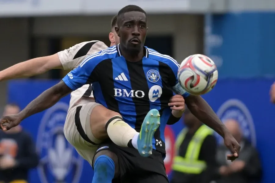 Apr 18, 2026; Montreal, Province of Quebec, CAN; Red Bull New York defenseman Dylan Nealis (12) defends against CF Montreal forward Prince Owusu (9) during the...