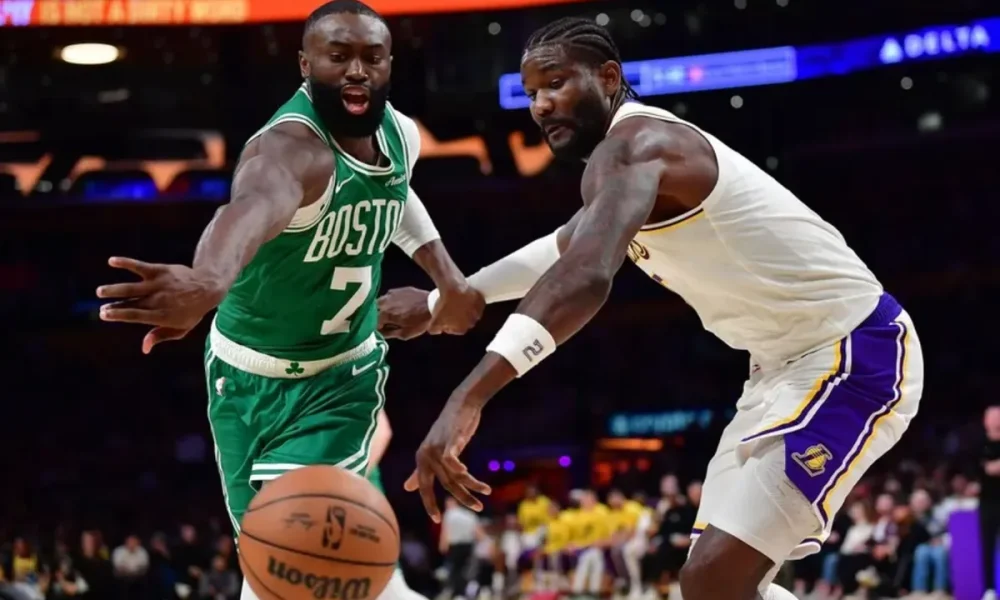 Feb 22, 2026; Los Angeles, California, USA; Boston Celtics guard Jaylen Brown (7) and Los Angeles Lakers center Deandre Ayton (5) play for the ball during...