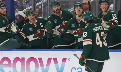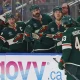 Jan 31, 2026; Edmonton, Alberta, CAN; The Minnesota Wild celebrate a goal scored by defensemen Quinn Hughes (43) during the second period against the Edmonton Oilers...