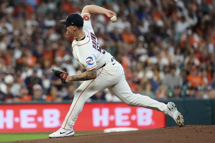 Mar 26, 2026; Houston, Texas, USA; Houston Astros starting pitcher Hunter Brown (58) pitches against the Los Angeles Angels in the first inning at Daikin Park....