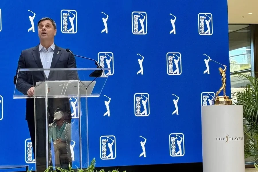 PGA Tour CEO Brian Rolapp addresses a the media, tournament sponsors and Tour employees during a news conference on March 11 at the PGA Tour Global...