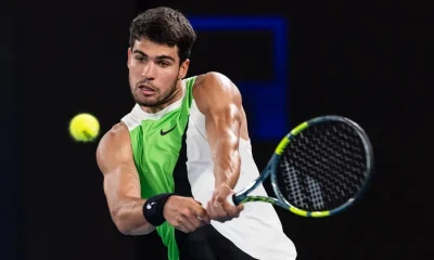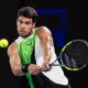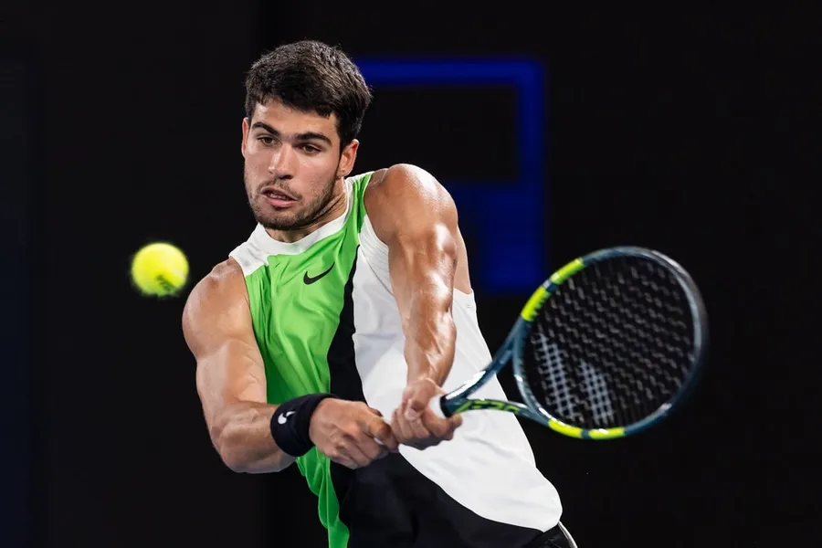 Jan 27, 2026; Melbourne, Victoria, Australia; Carlos Alcaraz of Spain in action against Alex de Minaur of Australia in the quarterfinals of the men’s singles at...
